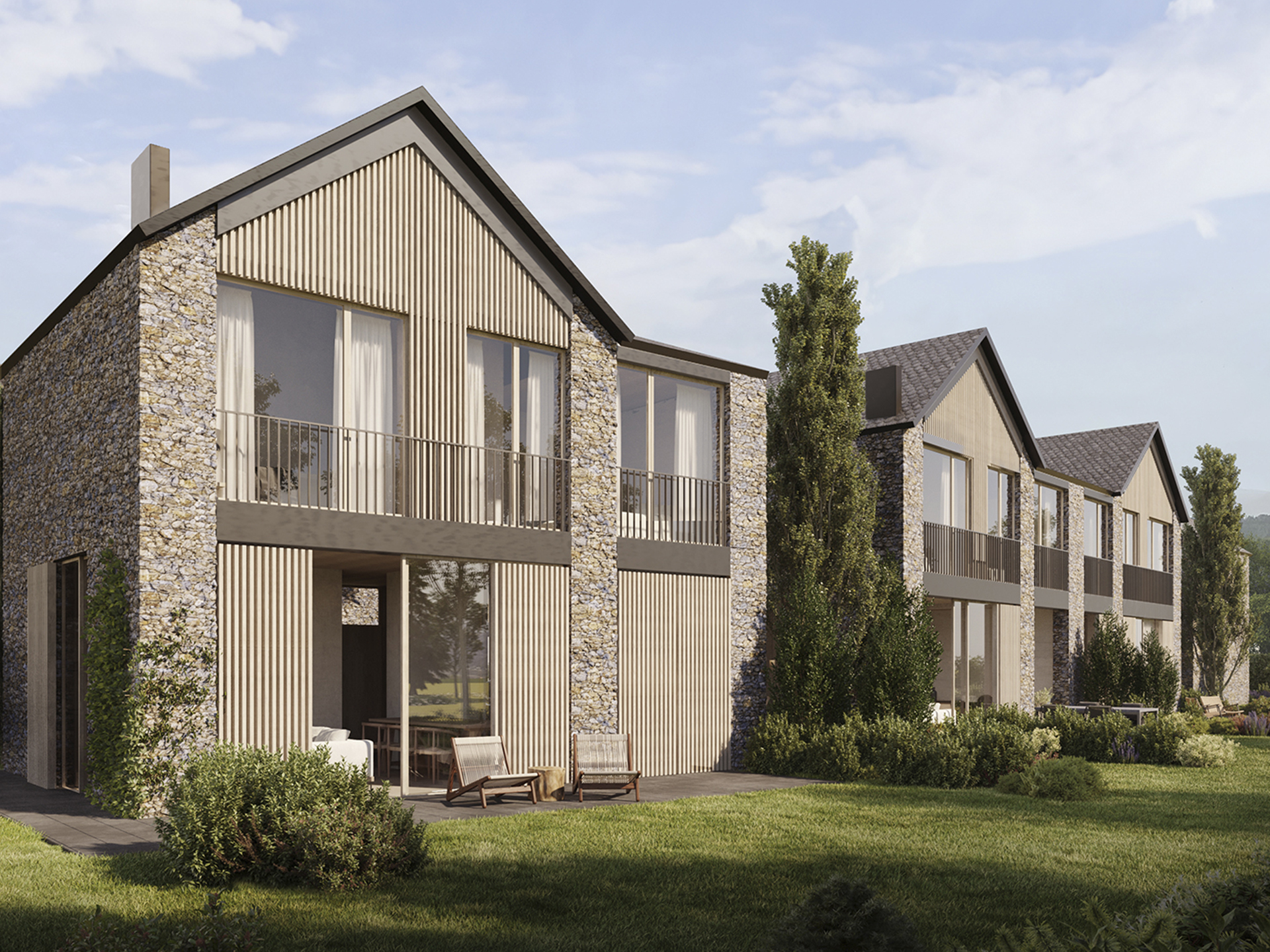 El proyecto se ha inspirado en la arquitectura moderna respetando lo entorno, utilizando materiales locales como la piedra y la madera para dar vida a una estética auténtica y encantadora. Cada vivienda ha sido planteada con esmero y detalle, con amplias ventanas para capturar las espectaculares vistas de las montañas de la Cerdanya.